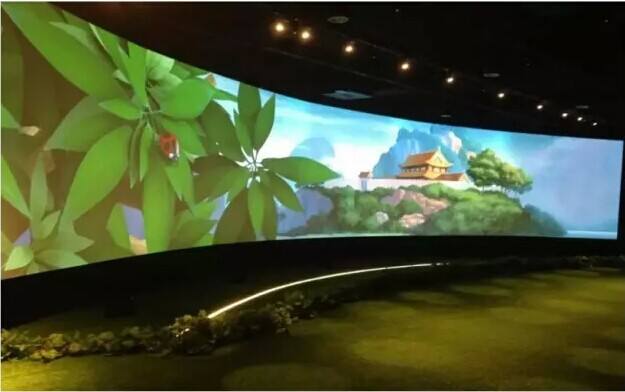 主要以环形或者弧形又或者是曲面为投影幕的多媒体互动投影,将观众围绕在环幕的中的圆心,环形的屏幕上呈现出大的画面,充分满足了观众对视觉的要求,再加上环绕式的立体声效与影片内容相融合,演绎出一种沉浸式的美轮美奂的视听盛宴。