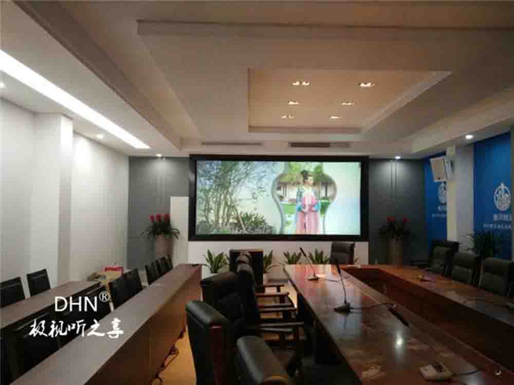 对于深圳中铁集团会议室吊顶设计,考虑后期长时间使用与稳定性等问题,投影机安装不能直接顶部安装,故而投影安装位置则采用托盘,分成两列进行安装。功能上,在多人会议讨论时,充分运用DM907触控功能,实现交互式应用。